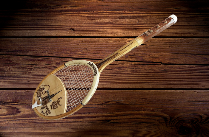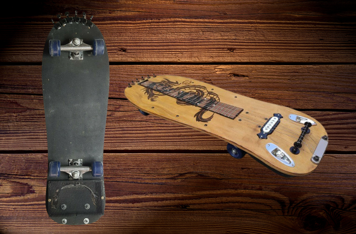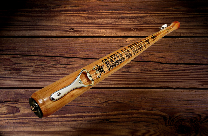 Mazza da baseball trasformata in uno strumento musicale a tre corde.
