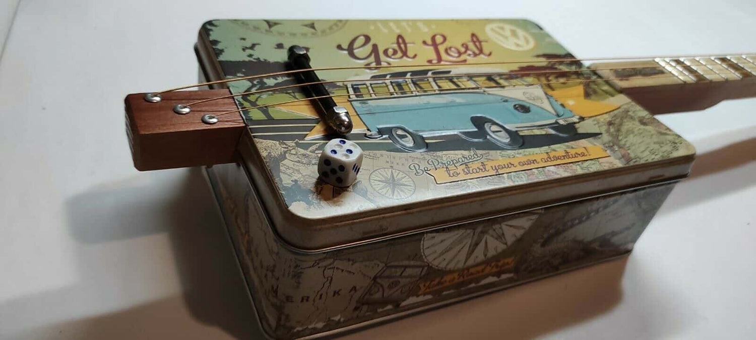 Ciao Amici e amiche, questa Cigar Box Guitar l'ho realizzata con una bella scatola di metallo  Pulmino Wolswaghen .