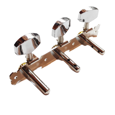 A questo punto montiamo le meccaniche. Posizioniamo le boccole nei fori, infiliamo le meccaniche e le fissiamo con le viti.